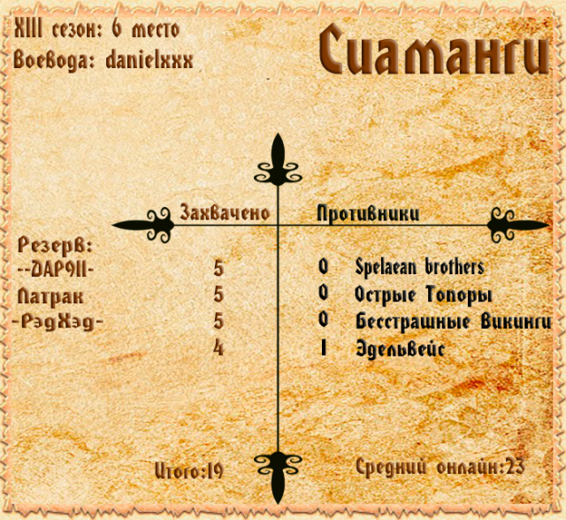 Ooykc: Бой получился быстрый, но захватывающий :) Как всегда, один остров мы слили (синий), на красном наши убивашки забили 14 с радужным кастом (джах его не покусал), на золотом против 18-го шансов не было, на сером 17-й также был на радужном касте и бил нехило, но на помощь пришел джах, он и спас ситуацию. Решающая битва на зеленом с воеводой на колодах длилась недолго, банально взяли количеством! Пользуясь случаем хочу поблагодарить соклан за неплохую явку, ибо данное мероприятие не было запланировано.
