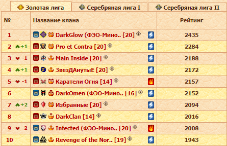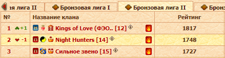 Up to Great и Night Hunters в десятом туре упрочили свое лидерство в первой и второй бронзовых подлигах соответственно. В суммарном рейтинге именно эти два клана были претендентами на продвижение в серебро, но переходов, как и на прошлой неделе, не произошло.