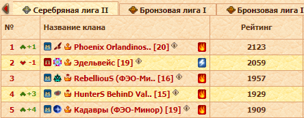 В битве за лидерство в подлиге кланы поменялись местами: Phoenix Orlandinos заняли первую строчку, а Эдельвейс – вторую. В Серебряной лиге II Орлы занимают достаточно уверенную позицию. Остался только один клан, который может навязать им борьбу за лидерство - RebelliouS. Впрочем, не исключён вариант поражения Phoenix Orlandinos клану из Золотой лиги, в этом случае потеря первой позиции практически неизбежна. Но и шансы на подобный сценарий не так уж и велики.