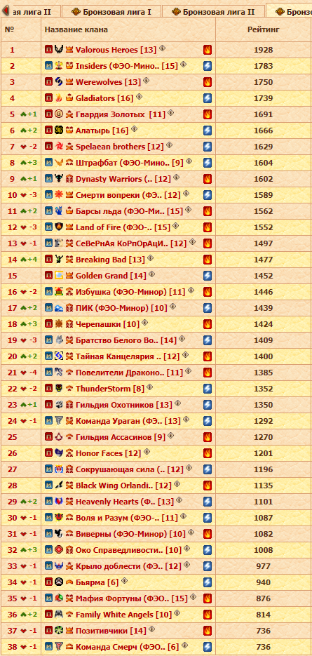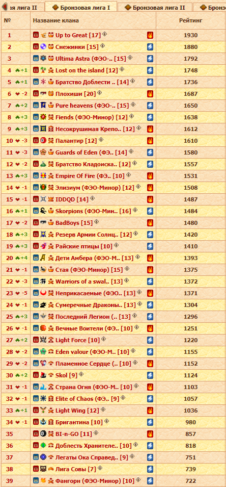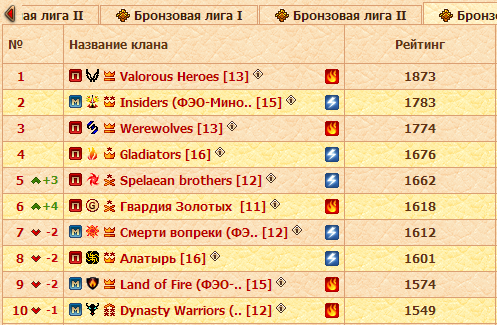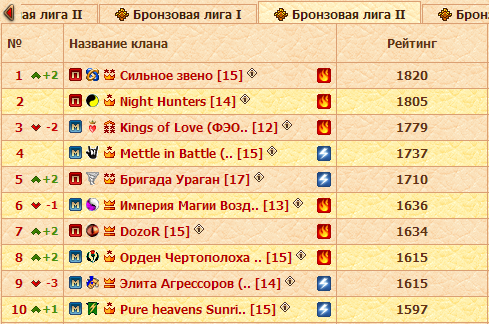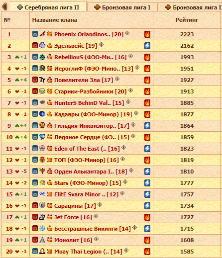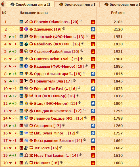 Четвертое место в С2 занял ИероглиФ, пропустив 13-й тур и RebelliouS в рейтинге. А пятыми пришли к финишу Повелители Зла, в последний день соревнования минимально одолевшие Орден Алькантара I. Добротная часовая клан-битва, в которой решающим фактором, похоже, оказалось большее количество резервистов у магмаров Прайма.