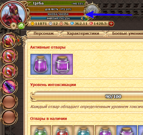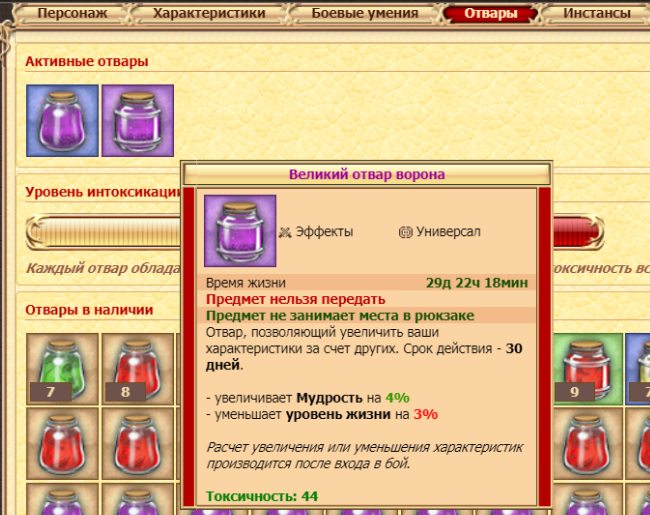 - Нельзя выпить отвар, если его токсичность > чем оставшийся уровень интоксикации в шкале.