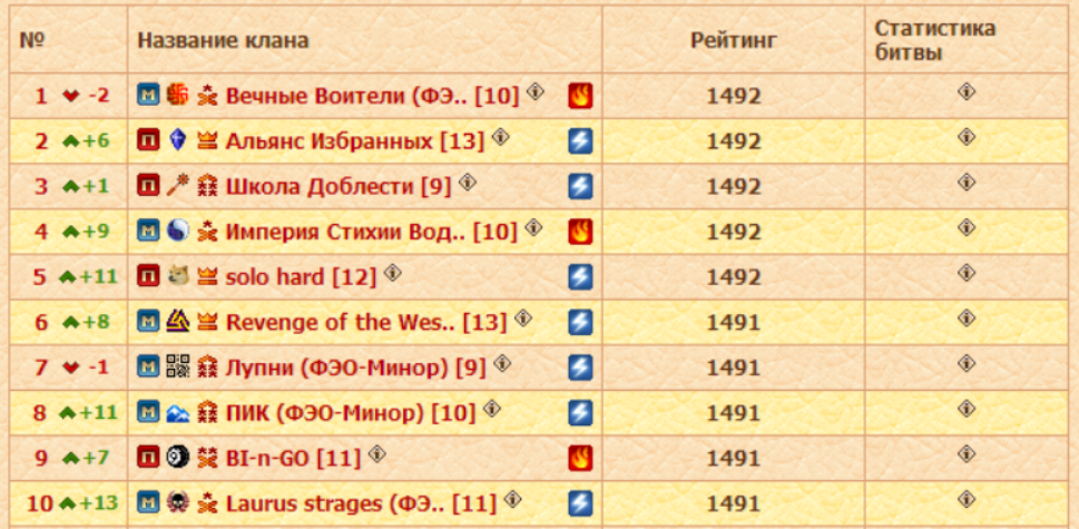 В понедельник ряды соискателей пополнились в Первом Дивизионе еще восемью кланами. Список участников расширился таким образом до 52-х кланов, а непосредственно во втором туре сформировались 24 боевые пары. Уже после сражений турнирная таблица, если говорить о первой десятке лидеров, приобрела вполне логичный и прогнозируемый вид. Судите сами: