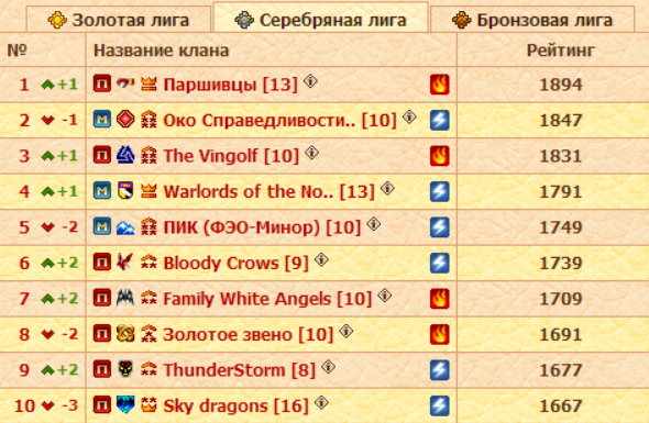 Смешанных пар золото/серебро в понедельник не было, все кланы высшей лиги "варились в собственном соку". Как не было и переходов между лигам по итогам последнего отведенного на это дня. Смерти вопреки - последний клан Золотой лиги - с запасом в 44 балла сохранил прописку в элите. При этом Паршивцы - лидеры Серебряной лиги - опережали сразу четыре клана-участника золота по набранным очкам. Но сравнения в данном случае не совсем корректны, в золоте набрать солидный рейтинг все-таки сложней, нежели лигой ниже.