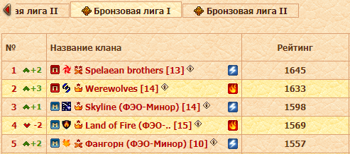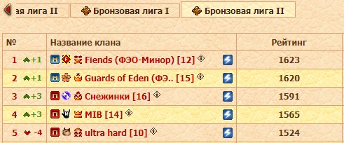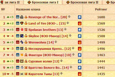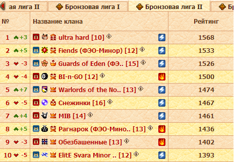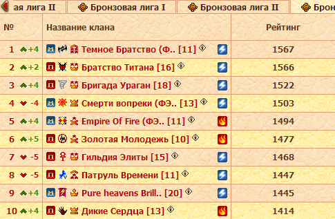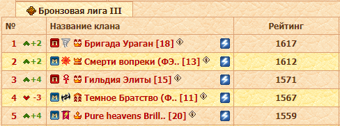 В Бронзовой лиге III тоже смена лидера. На вершине Бригада Ураган, потушившая пламя миноровцев из Empire Of Fire. Прежний обитатель первого места не позволил себя свергнуть в ратном бою. Темное Братство просто пропустило тур.