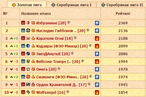 Первые две строчки в рейтинге Золотой лиги по-прежнему занимают Избранные и Наследие Гиббонов. Такая расстановка, вероятней всего, сохранится до самого финиша. А на третью позицию в четверг вышли Каратели Огня. Встреча этого клана с Омега носила формальный характер. Люди Прайма решили, что в этот день им вредно на ночь глядя кушать обкаст, поэтому все вопросы были решены за девять минут. Магмары заработали 91 балл и потеснили в таблице Bellicose Tramps. Омега сместилась с шестой строчки на седьмую.
