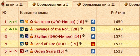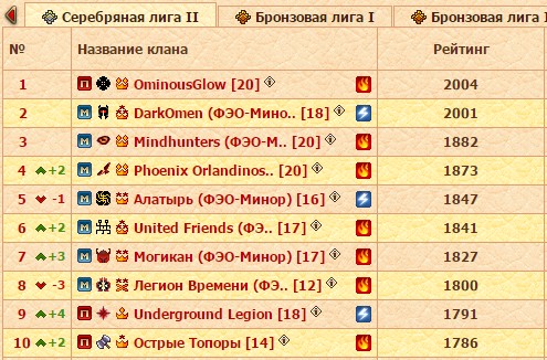 Бронзовая лига буквально выстрелила залпом кланов, которые поднялись в серебро. Всего за один тур, состоявшийся на неделе, повышение получили Spelaean brothers, Werewolves, Снежинки и Fiends.