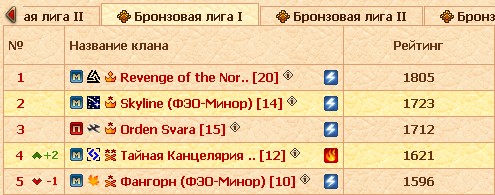 В Бронзовой лиге I теперь уже экс-лидер Фангорн со счетом 0:5 уступил Revenge of the North. Север таким незамысловатым образом снова занял первое место, а проигравший клан был вытеснен за пределы топ-3, на четвертую позицию.