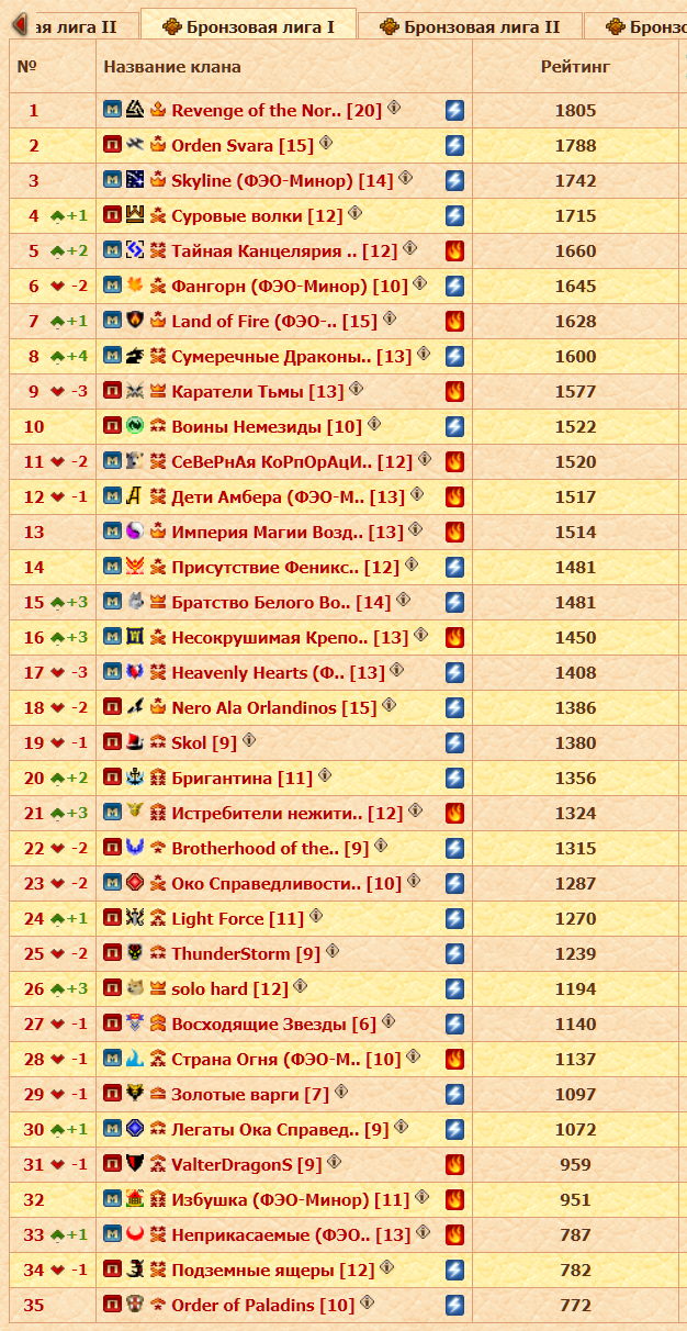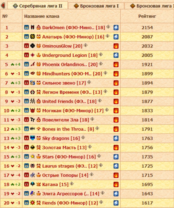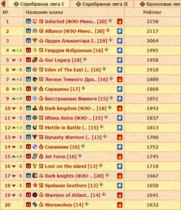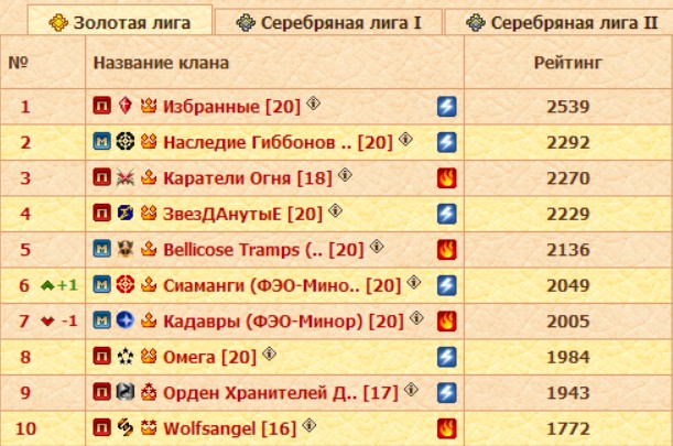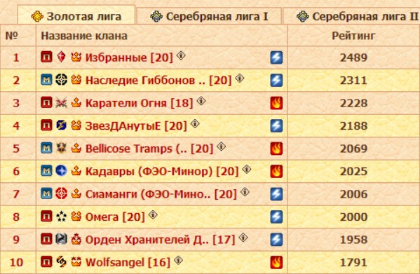 В Серебряной лиге I после финальных боёв позиции первых девяти кланов не изменились. При этом шесть из них последний тур не посетили! Накал страстей, как говорится, на лицо. Мотивация, настрой, судьбоносные жаркие баталии – всего этого не было.