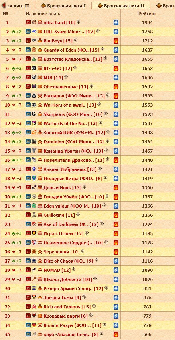 Победителем Бронзовой лиги II с огромным отрывом от преследователей стали ultra hard. Финальную точку этот клан поставил в битве против Братство Кладоискателей, одержав победы на островах на любой вкус. Даже тандем 16-тых уровней небольшой стенкой из бойцов девятого-десятого лэвла одолели.