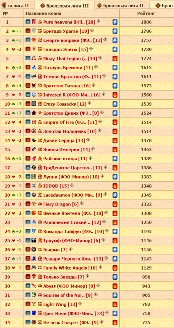 В Бронзовой лиге III Pure heavens Brilliance без вариантов разобрались со Смерти вопреки, расчистив для Гильдия Элиты путь ко второму месту. Гильдия шанс не упустила, быстро справившись с Дикие Сердца. Также в топ-3 подлиги оказалась Бригада Ураган, лишь с небольшой осечкой пройдя проверку Патруль Времени – 4:1. А времени на это ушло немного – 21 минута.