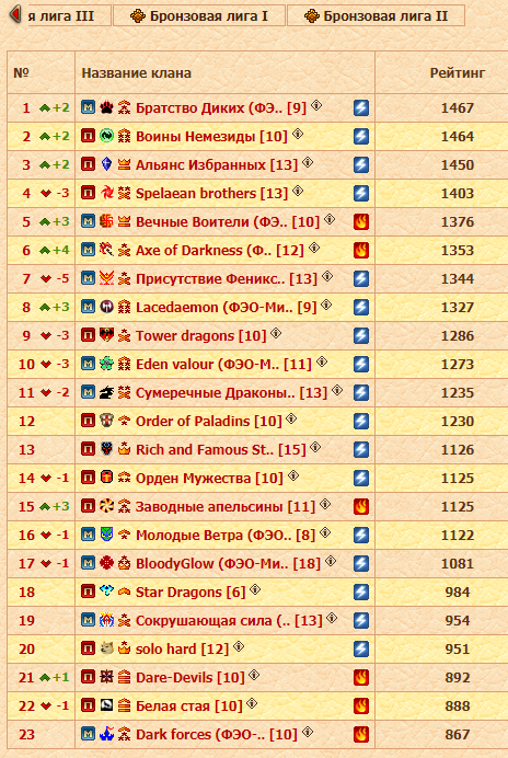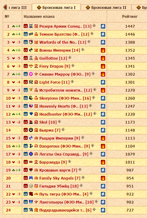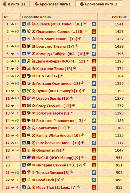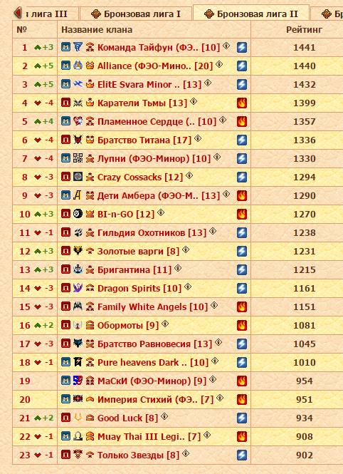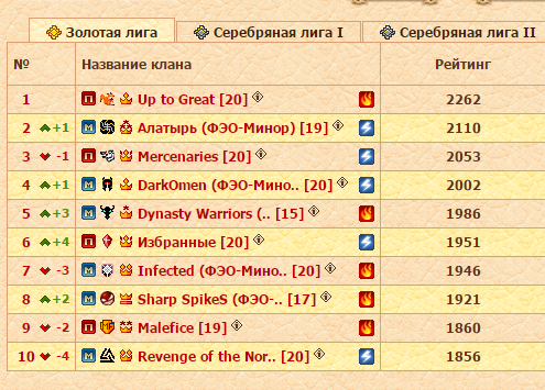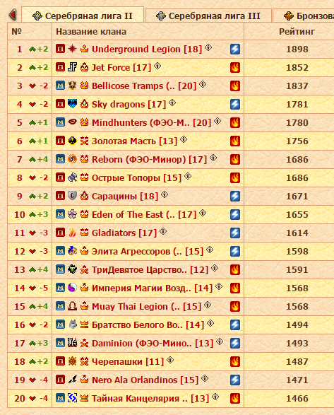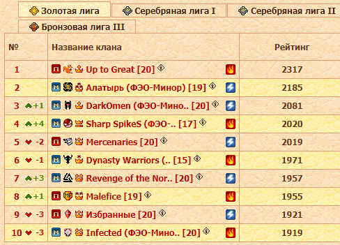 На первых местах трех бронзовых лиг – Guillotine, Alliance и Братство Диких. Максимально эклектичная подборка. Альянс, конечно, особо выделяется, но здесь сказываются пропуски и технические поражения этого клана.