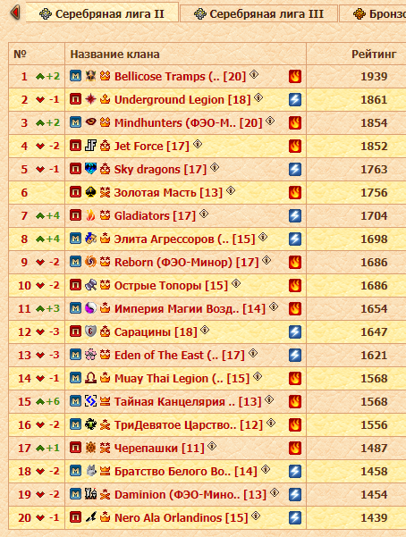 Bellicose Tramps захватили лидерство во втором серебре, воспользовавшись неудачей в стыковом сражении Underground Legion. Сами Трампы тем временем уверенно справились со Sky dragons. И теперь именно они с рейтингом 1939 очков главные претенденты на повышение в классе. Только вот кандидатов на понижение в золоте пока нет.