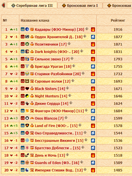 Dark knights – прогул и падение на четвертое место. Пятым кланом С3 стало Сильное звено, в шикарном стиле обыгравшее 3:2 Black Sisters. Кстати, в этой подлиге оказалось сразу шесть праймовских кланов, представляющих Хаир: Позитивы, Звенья, Старики, Систерс, Хантеры и Дикие Сердца. И все они на местах с 11-го и выше, поэтому каждый тур случается какая-либо встреча соседей-земляков. Но вернемся к Звеньям и Ведьмочкам. Четыре острова фактические размены. А в решающем противостоянии воевода -_ХуДожНик_- был вынужден воевать с целым ведьмовским ковеном – четыре резервиста и семеро бойцов изначального построения. Правда, без резервистов остров явно посильнее у Звеньев смотрелся, но тем не менее задача у рулевого была непростая. Однако он справился, 223 тысячи урона, соперники повержены, победители в топ-5 своей подлиги.