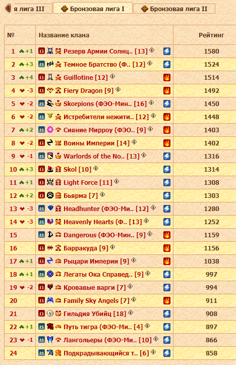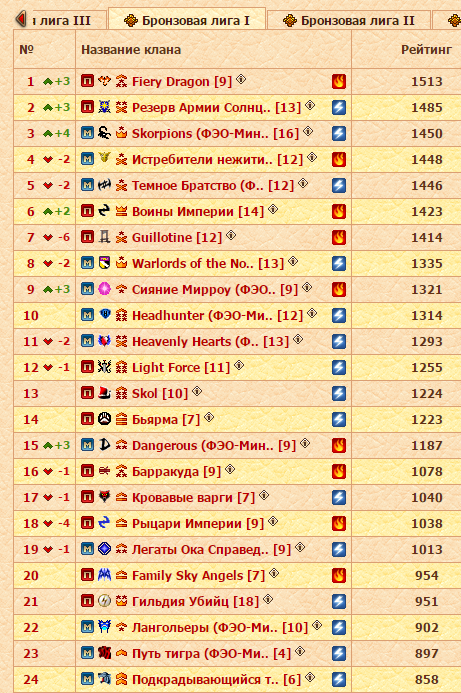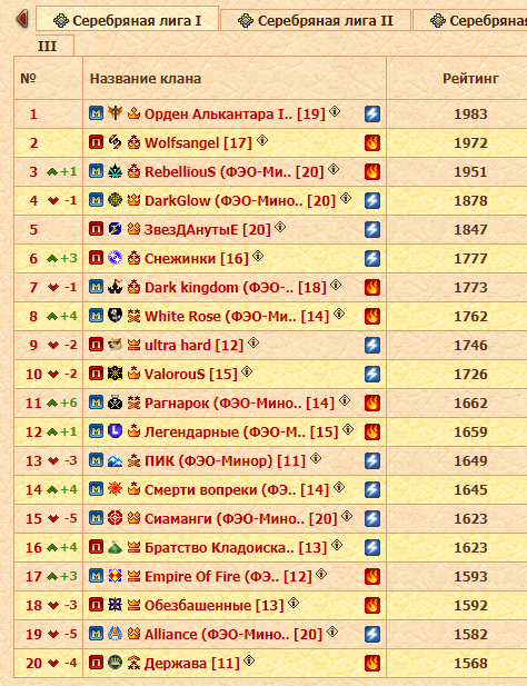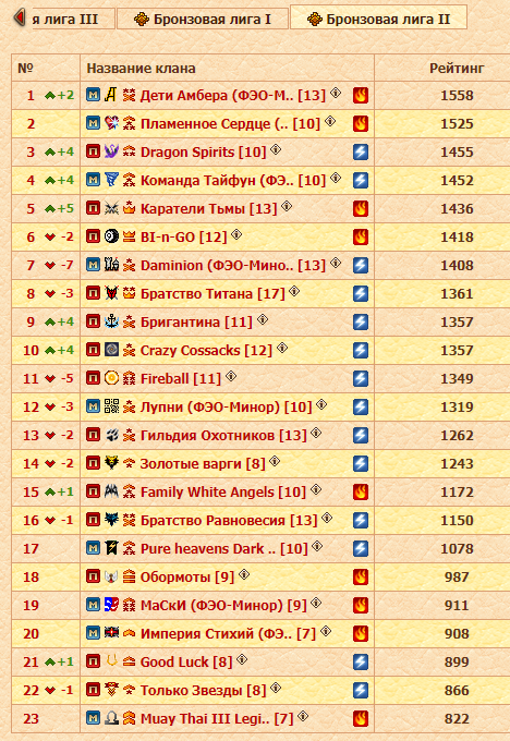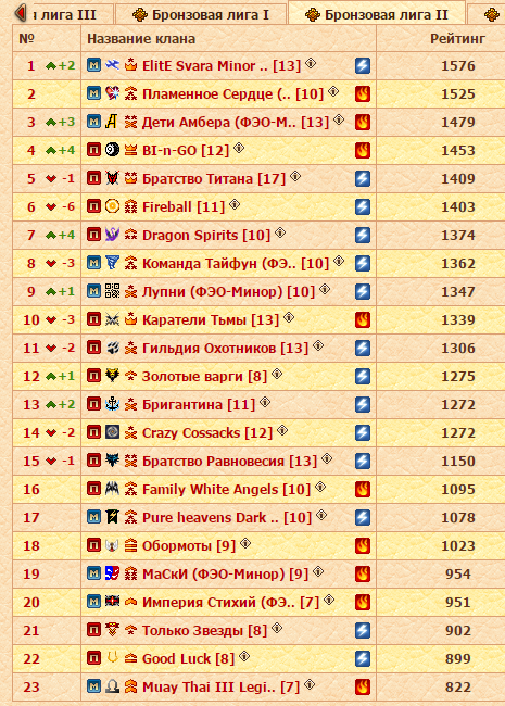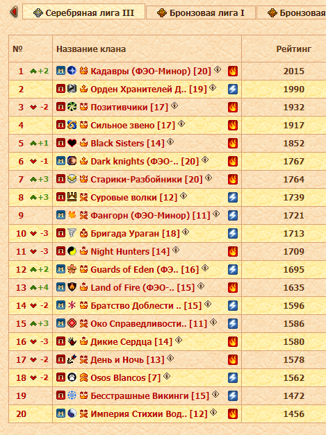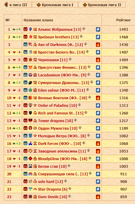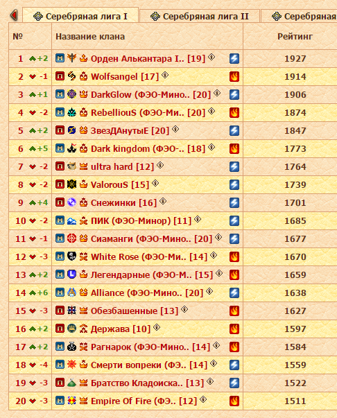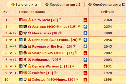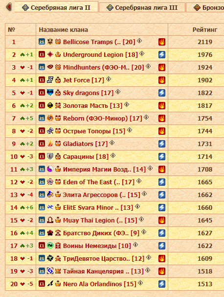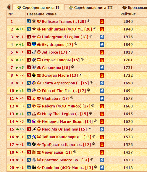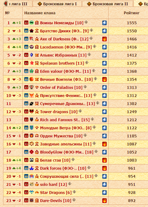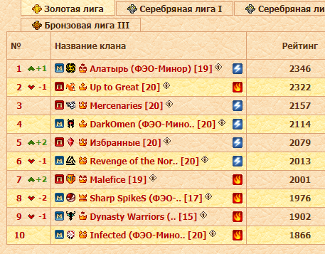 И это еще не всё. Ряды серебряных лиг пополнили сразу три клана! Помимо Свары, это Воины Немезиды ( неявка Братство Белого Волка) и Братство Диких ( победа над Axe of Darkness). Но понизились при этом Daminion, Братство Белого Волка и... Черепашки. Почему? Потому что Axe of Darkness – клан бронзовой лиги, да и вообще при переходах учитывается только рейтинг, а не позиция клана в какой-либо из подлиг.