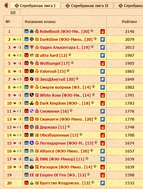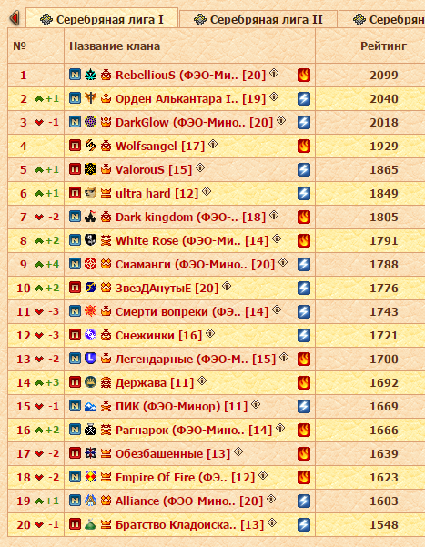 После заключительных сражений лидерами в первом серебре остались RebelliouS. «Финальный босс» для этого клана оказался не страшен, миноровцы настолько быстро расправились с Wolfsangel, что их воевода даже не вступила в бой. Волки заняли пятое место в подлиге. Судя по предсезонному интервью, задачу-максимум на сезон RebelliouS выполнили, финишировав первыми в одной из серебряных лиг.