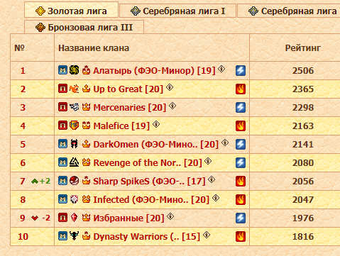 Сражение завершилось на час раньше, нежели прошлая встреча кланов. И увенчалось впечатляющим реваншем миноровской команды. Теперь к турнирной таблице. В обзоре боёв, состоявшихся в понедельник, мы отметили удобную площадку для финишного рывка Шипов. Клан его совершил, прыгнув с девятого места на седьмое. Собственно, победители поменялись местами с проигравшими. Экс-чемпионы турнира – Избранные – завершили соревнование на девятой позиции Золотой лиги.