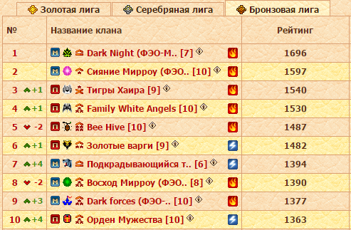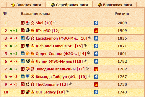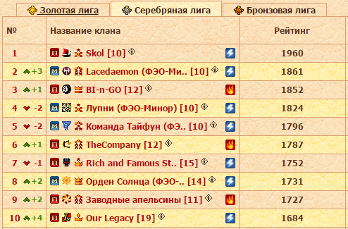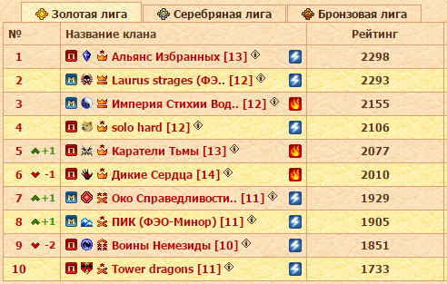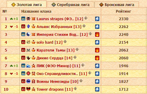 Диспозиция следующая. Лидирующие Laurus strages в заключительном туре точно не встретятся с Карателями и Империей Стихии Воды. Идущий вторым Альянс Избранных не сыграет в понедельник с Солохардами и Водой. Немного отстающие от Ромбов Империя Стихии Воды, как несложно догадаться, имеют в бане на последний тур Лаурусов и Избранных. solo hard в соперники не могут получить Альянс и Око Справедливости. Каратели Тьмы не будут воевать против Легионеров и Ладох. А Дикие Сердца, помимо Карателей, не получат в соперники Воины Немезиды. Теперь давайте вместе посмотрим на турнирную таблицу. Самыми вероятными парами выглядят Ромбы-Лаурусы, Вода-Соло, а Каратели и Ладохи в таком случае встретятся с кланами из нижней половины Золотой лиги. То есть чемпионский бой и сражение за серебряные и бронзовые медали турнира! Более насыщенный и захватывающий финал представить себе сложно. Но и другие варианты жеребьевки отметать не следует, а в них потенциальных перестановок в рейтинге еще больше.