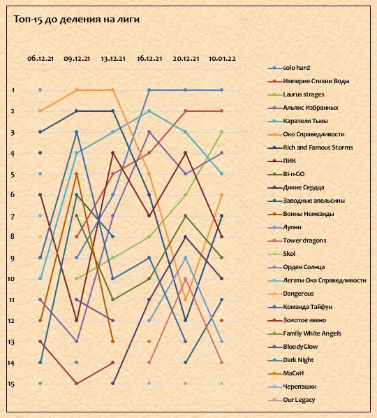ОтрезвителЬ: Как было подмечено, этот сезон отличился сохраняющейся интригой вплоть до последних боев, в первую очередь из-за того, что сразу несколько кланов были примерно равны по силе, и, соответственно, могли претендовать на первое место. Если и был какой-то перекос, то он размывался по причинам, описанным ниже. И исход буквально каждой встречи было сложно предугадать, а действия и решения кланов удивляли раз за разом, что вынуждало менять стратегии как для стенки, так и для ударки с резервом по несколько раз за сезон. Теперь, в связи с нововведениями, бои стали гораздо динамичнее, а значит большую роль играли умение работать в команде, принимать верные решения, находясь в критической ситуации, а также, конечно же, везение: приход богов (хорошим решением данной проблемы был ввод в игру эффекта Сумерек Богов, однако из-за того, что стойкость игроков была порезана, а ведение боя в соответствии с этим пересмотрено, то и бой редко длился больше двух-трёх часов), станы на медведе и неигровые моменты, что тоже немаловажно.