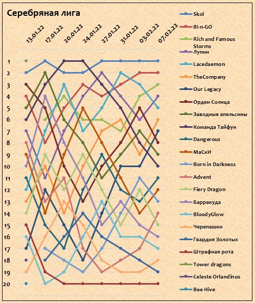 Skol с отрывом в 53 балла уверенно завоевал первое место в серебре. В активе этого клана по две победы над Tower dragons и Lacedaemon, также были повержены Лупни, Rich and Famous Storms и BI-n-GO. В целом Драккары победили 10 раз, уступив лишь Солохардам, Ладохам и Воинам Немезиды. Результаты солидные, что отразилось и в рейтинге по суммарному урону, нанесенному командой в рамках сезона – Скол на девятом месте по этому показателю. А DrLivesey оказался в топ-5 в индивидуальном зачете.