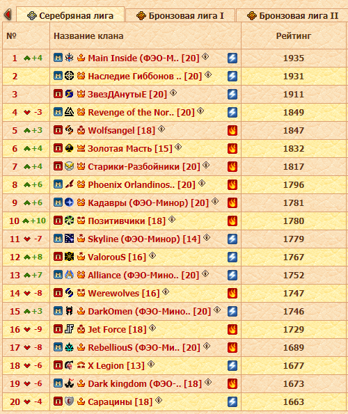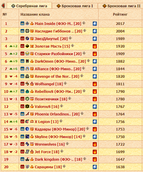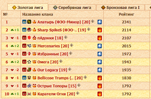 Золотая Масть поднялись на две позиции и занимают четвёртую строчку в Серебряной лиге. Поражение тяжело сказалось на позициях Кадавров – утрачены сразу шесть пунктов, и итоговое место лишь 15-ое. Однако пройти мимо выступления Цыруса мы не можем, поэтому и вручаем ему звание "Один в поле воин"! Надеемся, это придаст клану дополнительной мотивации в следующих битвах.