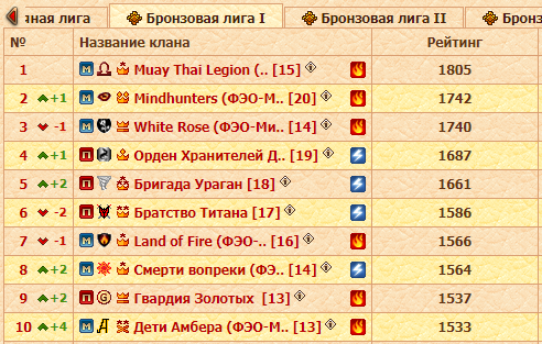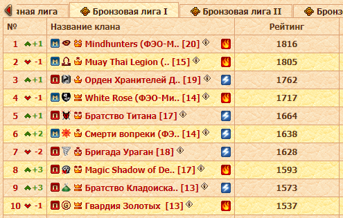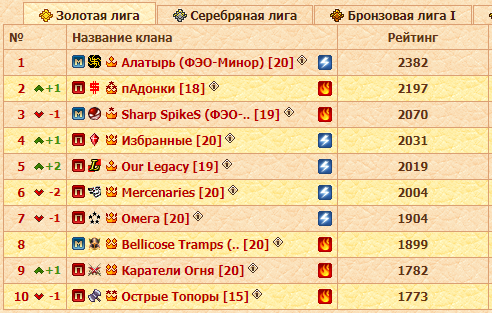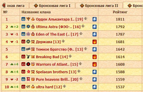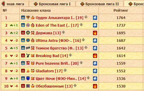 Что касается подлиг, всё выше и выше по строчкам поднимаются несколько кланов, хотя Наследие Гиббонов своё место уступать соседям по таблице явно не собираются, и кто знает, возможно и им удастся пробить себе дорогу в высшую лигу. А в каждом бронзовом зачете ситуация своя: в предыдущих двух турах лидеры были бессменны, сейчас же ситуация изменилась, разве что в третьей подлиге Орден Алькантара I удерживают позиции, но Ultima Astra отстают от них всего на 19 очков.