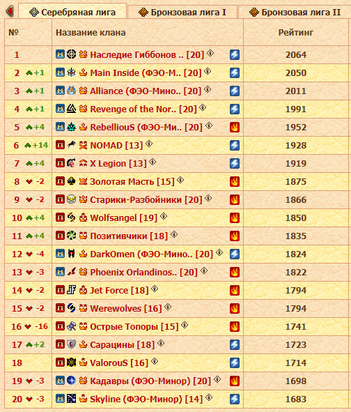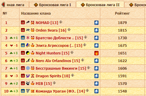 Как уже была сказано блоком выше, после боя с Элита Агрессоров удалось пробиться в Серебряную лигу. Лидером таблицы стали Orden Svara, а следом за ними идет Братство Доблести. Оба клана пропустили битву в четверг. Склоняемся к тому, что это был стратегический ход – количество очков у коллективов позволяло им не выйти на поле боя без риска быть кем-то обогнанными.