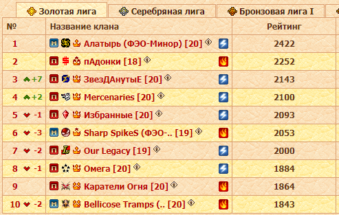 Количество прошедших туров уже переваливает за десяток, как любит кое-кто повторять: «Времени на раскачку нет». Даже если бой за боем заканчиваются поражением, стиснув зубы, многие команды продолжают двигаться вперед, несмотря ни на что. А между тем, остались считанные туры, и явные лидеры некоторых лиг уже значительно выбиваются из общей массы. Что касается, скажем, золота, то здесь не лишним будет упомянуть, что за исключением намеренных (а может и случайных) невыходов на поле боя и нежелания давать бой десятка лучших выглядит более, чем достойно. Однако на этой неделе случилась рокировка между Золотой и Серебряной лигами, и по набранным очкам вскарабкавшиеся на вершину ЗвезДАнутыЕ сразу же вошли в топ-3. Довольно мощный прорыв! Есть еще немного времени, чтобы проверить на деле, как они будут чувствовать себя среди более опытных и слаженных коллективов, и смогут ли они побороться и сохранить свое место на пьедестале. Тем временем, бессменными лидерами лиги остаются Алатырь и пАдонки. Любопытно было бы посмотреть на еще одно их противостояние, но на всё воля жребия.