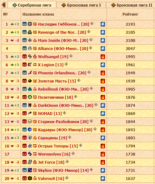 Клану Острые Топоры тяжело приходится во второй части Серебряной лиги. Сначала нелёгкая победа над Werewolves, теперь же - сокрушительное поражение от Phoenix Orlandinos. Возможно, коллектив деморализовала невозможность удержаться в Золотой лиге. Сейчас же клан на 16-ой строчке в серебре и имеет только один шанс слегка улучшить свои позиции. Орлы смогли подняться на три позиции выше, и остановились на седьмом месте.