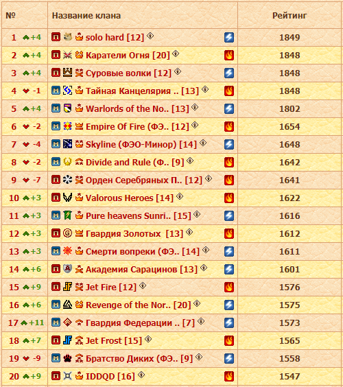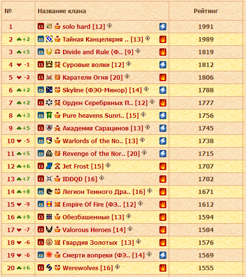 Турнирная таблица меняется с такой скоростью, что временами даже голова кружится от прыгающих с места на место кланов. Скоро все устаканится, а новоиспеченным лидерам расслабляться нельзя, ведь вчерашние аутсайдеры уже скоро могут задышать в спину.