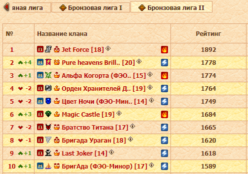 На будущей неделе нам предстоит узреть два последних тура текущего сезона (учитывая один из добавленных). Положение дел на данный момент обстоит следующим образом: Up to Great занимают в Золотой лиге первое место с отрывом в 195 очков от своего ближайшего преследователя Алатырь, и догнать их возможность вряд ли представится. Да и сам Алатырь свои позиции сдавать не намерен, как и Омега, держащие пока в руках бронзовую медаль. А вот между кланами, занимающим с четвертого по седьмое место в турнирной таблице, может еще завязаться нешуточная борьба: разница между их положением в рейтинге минимальна, так что рокировки могут произойти при самых неожиданных раскладах, ведь на всё воля рандома.