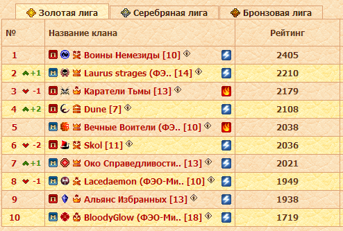 Без помощи резерва кланы разыграли только синий остров. На нем миноровская ударка смогла разложить по кирпичикам стенку противника. Не знаем, какая именно Волшебная травка выросла на зеленом острове, но благодаря ей Избранные одержали на нем победу. Большая часть Топориков на золотом острове показала почти одинаковые цифры по урону. Настоящая командная работа! Оружия синхронно взлетали вверх и входили в соперников как в МяГкИй КаМюШеК. На красных песках встретились воеводы обеих команд. В результате продолжительного противостояния Santifik_Legenda приводит свой коллектив к победе. На серых песках постепенно таяла стенка Топориков, и на подмогу ей вышел только один резервист. Этого было явно недостаточно, Избранные смогли забрать себе очко в копилку за этот участок. По итогам этой баталии Lacedaemon поднимаются на седьмую строчку, а Альянс Избранных остаются на девятом месте.