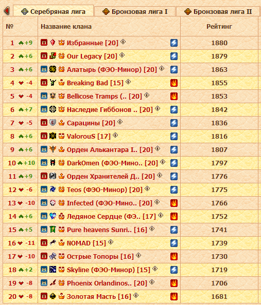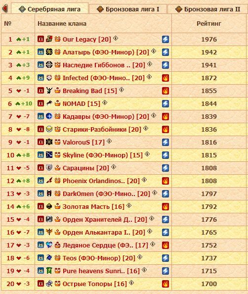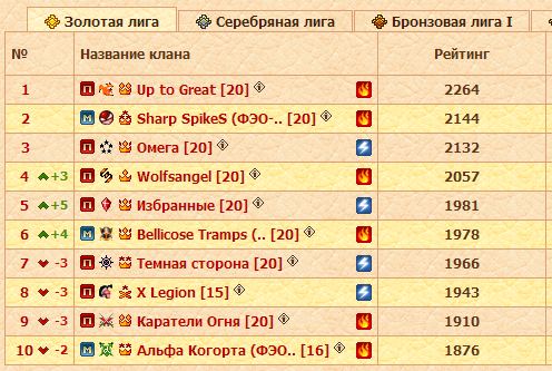 В текущем сезоне распределение на лиги произошло уже привычным образом: 10 команд в Золотой, 20 в Серебряной и по 41 в каждой из трёх бронз. Лица в лигах постоянно меняются, ведь исходя из количества очков, претендентов на место повыше в каждой категории хоть отбавляй. Кланы из золота хорошенько закрепились на своих позициях и уступать никому не собираются, но и дышащие им в спину товарищи из серебра не лыком шиты! Хороших команд на ивенте много, а вот мест в лиге всего десять, так что придется попотеть.
