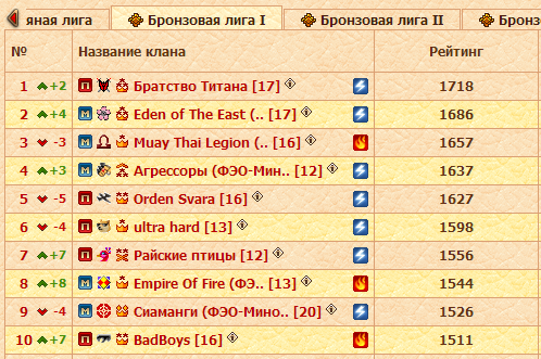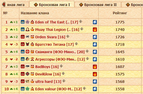 К клановой войне 3-5, объявленной в нововведениях первого апреля (совершенно точно не шутили по этому поводу!), усиленно готовятся Хищные Тигры. В битве с Страна Огня «малыши» показали, что их явно не стоит недооценивать – оба выигранных острова они отбили у бойцов магического уровня. Несмотря на это, Страна Огня все же забирает оставшиеся три точки, поднимаясь на 35-ую позицию, пока Тигры кубарем катятся вниз на 38-ую.