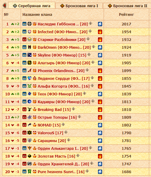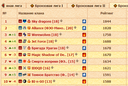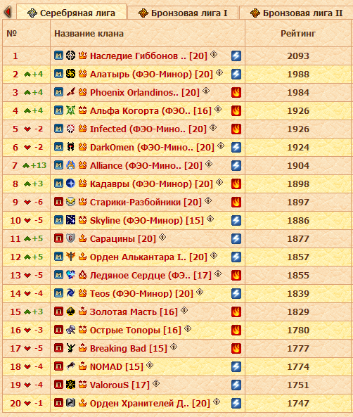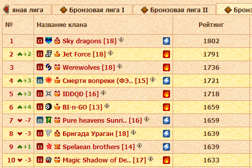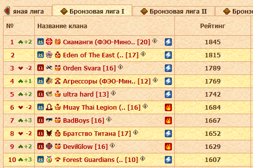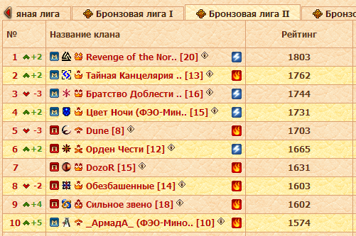 Расстановка сил в Бронзовых лигах меняется быстрее, чем перебиваются ставки на бирже. Вот и первое место второй лиги вместо не явившихся Братство Доблести теперь занимают Revenge of the North, одолевшие в бою предыдущего лидера лиги Dune. Песчаные воины решили особо не сопротивляться, понимая разницу в силах, и с честью приняли свою долю – падение на пятую строчку.