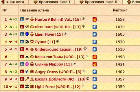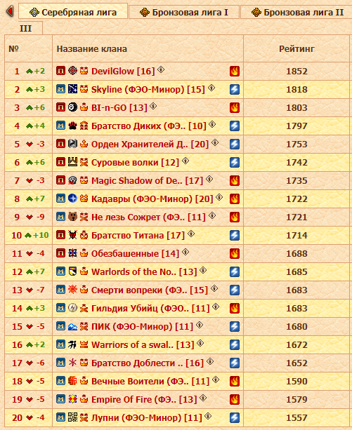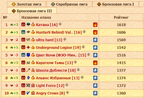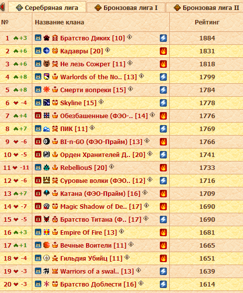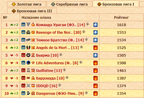 Valkeru решил отдать сходу один остров оппоненту, тогда как его оппонент ImI выбрала сбалансированную стратегию. Исход четырех боёв решился быстро – каждая из команд установила свой флаг на двух участках. Один из островов смог захватить силачок в очной дуэли с 15-ым уровнем! Воеводам не пришлось долго выбирать куда выходить, оба оказались на последнем острове. Несмотря на все усилия лидера Братства, им не удалось сломить сопротивление соперника в решающем поединке. Уверенная победа Шаров принесла им сразу шесть позиций – они ворвались в топ-3 Серебряной лиги! Братство также потеряли шесть строчек и вынуждены довольствоваться 17-ым местом.
