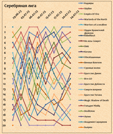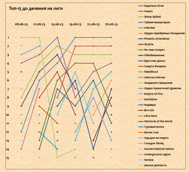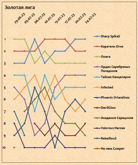 Разумеется, отдаем должное мы и золоту с серебром, интрига сохранялась чуть ли не до последнего боя. Sharp SpikeS собрали мощный состав, а их маневры в тактике помогали побеждать даже самых грозных соперников. Каратели Огня и Омега как всегда были на высоте, а Тайная Канцелярия и Орден Серебряных Паладинов пусть и несколько сдали позиции, но доказали, что в золоте они находиться достойны и есть еще порох в пороховницах. Борьба за 6-10 места в Золотой лиге также не была лишена элемента неожиданности. А что говорить о «серебряных» участниках, где первое место сменялось чуть ли не после каждого боя! Резюмируем – сезон прошел на «ура»!