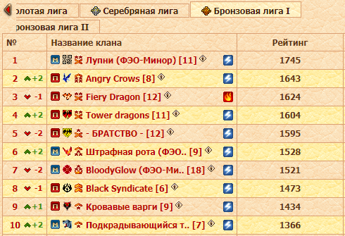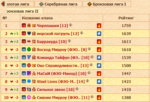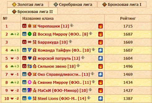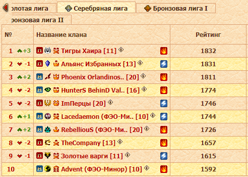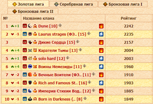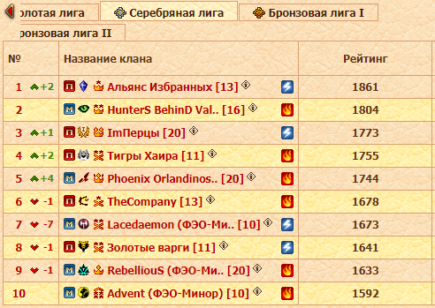 На прошедшей неделе устоявшееся положение в лигах прилично пошатнулось. Первой сенсацией стало смещение Laurus strages с их привычного места, пока лидирующую позицию в Золотой лиге занимают Dune. Третье место уже привычно закрепилось за Дикие Сердца, а вот ниже топа-3 происходят постоянные рокировки, тем более что там наращивают преимущество solo hard! Да и в других лигах иногда кланы отделяют друг от друга лишь несколько баллов, чего однако не скажешь о Черепашки, которые свое первенство в Бронзовой лиге II уступать, кажется, не намерены никому.